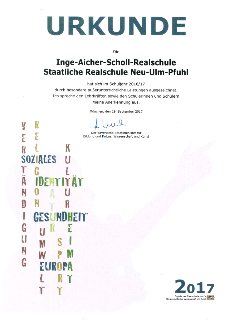 Die Inge-Aicher-Scholl Realschule wurde mit 81 weiteren Schulen aus Bayern am 23.11.2018 im Rahmen einer Festveranstaltung bei Google Germany in München als „MINT-freundliche Schule“ ausgezeichnet.
