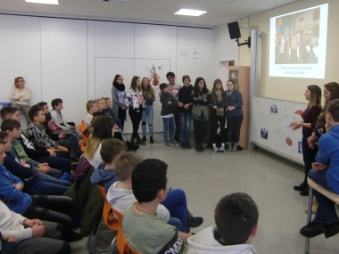 Zuerst führten einige Schüler der Klasse 7c den Sechstklässlern Dialoge aus Alltagssituationen vor. Danach folgte eine kurze musikalische Einlage auf Französisch.