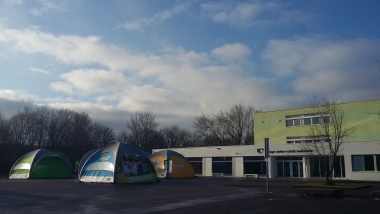 Natürlich musste niemand bei diesem mehrtägigen Projekt, das auf Initiative der Philipp-Lahm-Stiftung und der AOK Bayern ins Leben gerufen werden konnte, im Freien übernachten. Aber alle 5. Klässler durchliefen vormittags in einer Art Stationenarbeit alle 3 Riesenzelte, in denen sie zu unterschiedlichen Themenfeldern geschult wurden.