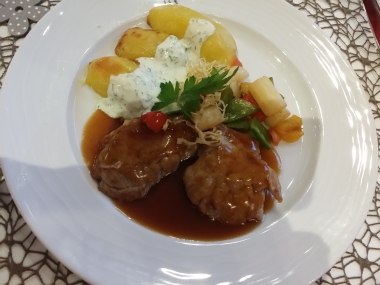 Gebratene Schweinemedaillons mit Gemüse und Kartoffeln aus dem Ofen.