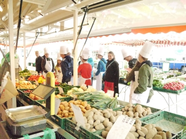 Am Mittwoch trafen wir uns um 8.00 Uhr auf dem Wochenmarkt in Neu-Ulm. Dort trugen wir eine Kochschürze, setzten einen Kochhut auf und
