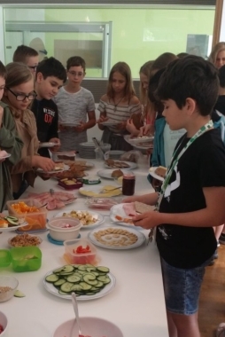 Die 7. Klassen bereiteten zum Trinken „gepfefferten Apfel“ und zum Essen „Hirsemüsli“ selbstständig in der Schulküche zu, außerdem gestalteten sie mit den mitgebrachten Zutaten ein Büffet, an dem sich die Fünftklässler ihr eigenes Pausenfrühstück zusammenstellen konnten.