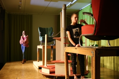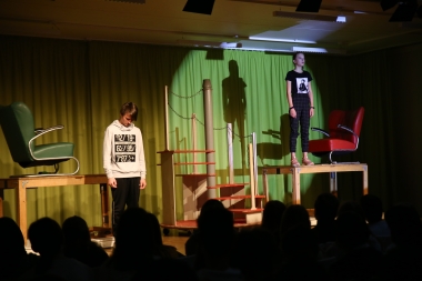Acht Schülerinnen und Schüler aus den 8. und 9. Klassen wurde einige Zeit vorher über ein Casting ausgewählt und arbeiteten dann zusammen mit Herrn Drozak von Montagmorgen bis Donnerstag an diesem interaktiven Stück. Am Donnerstagabend war dann Premiere für Eltern, Freunde und Lehrer und am Freitag folgten noch zwei Aufführungen für die Mitschüler.